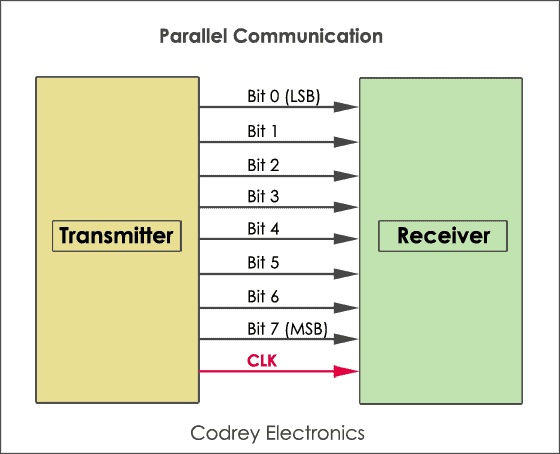 Přenos dat může probíhat dvěma způsoby - sériově a paralelně. Sériová komunikace je technika používaná k odesílání dat bit po bitu pomocí dvou vodičů, tj. vysílače (vysílače) a přijímače. Například pokud se mají poslat 8bitová binární data 11001110 z vysílače do přijímače, tak jaký kousek se přenese jako první? Most Significant Bit – MSB (7. bit) nebo Low Significant Bit - LSB (0. bit). V níže uvedeném obrázku se uvažuje, že se LSB přesune jako první (pro malého Endiana).