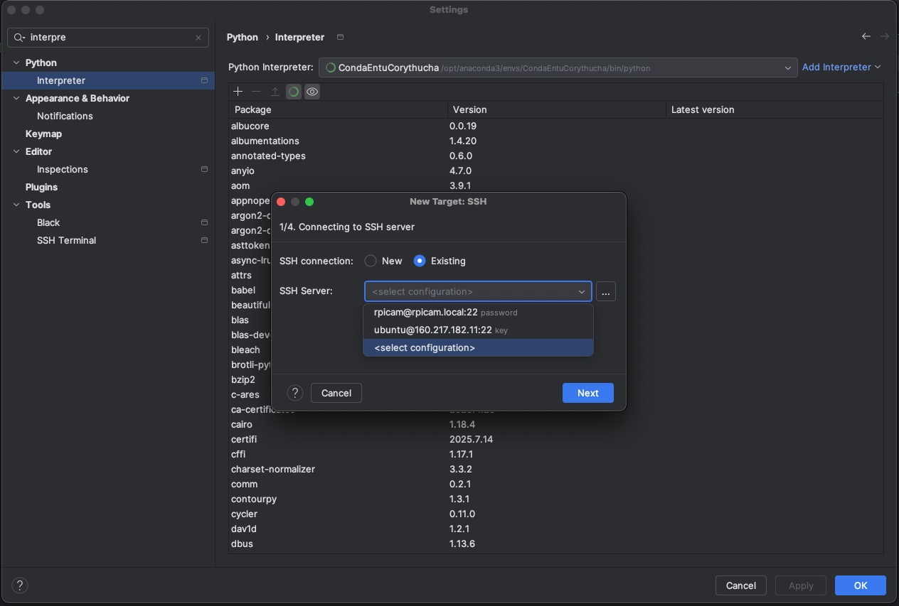 PyCharm si na serveru vytvoří vzdálené prostředí a nastaví ho jako aktivní interpreter.