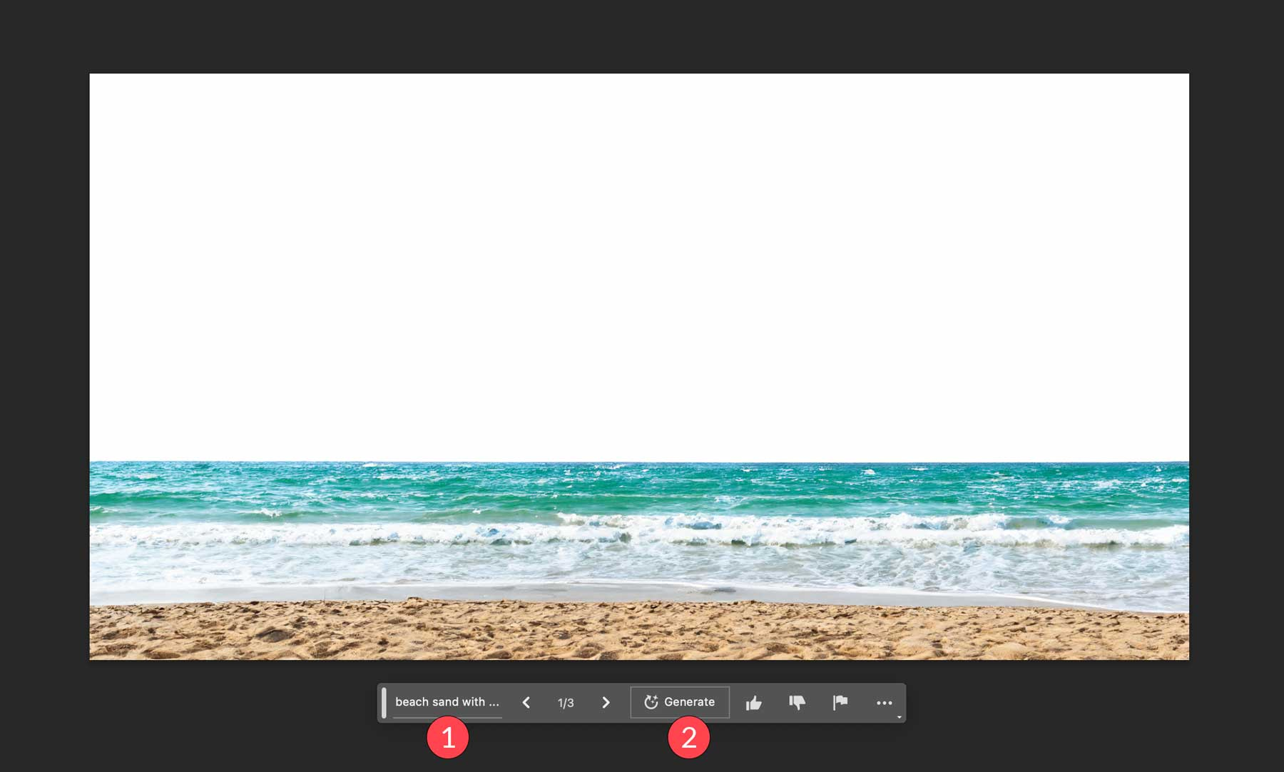 Pomocí nástroje generativní výplně zadejte plážový písek s vlnami oceánu a poté klikněte na generovat.