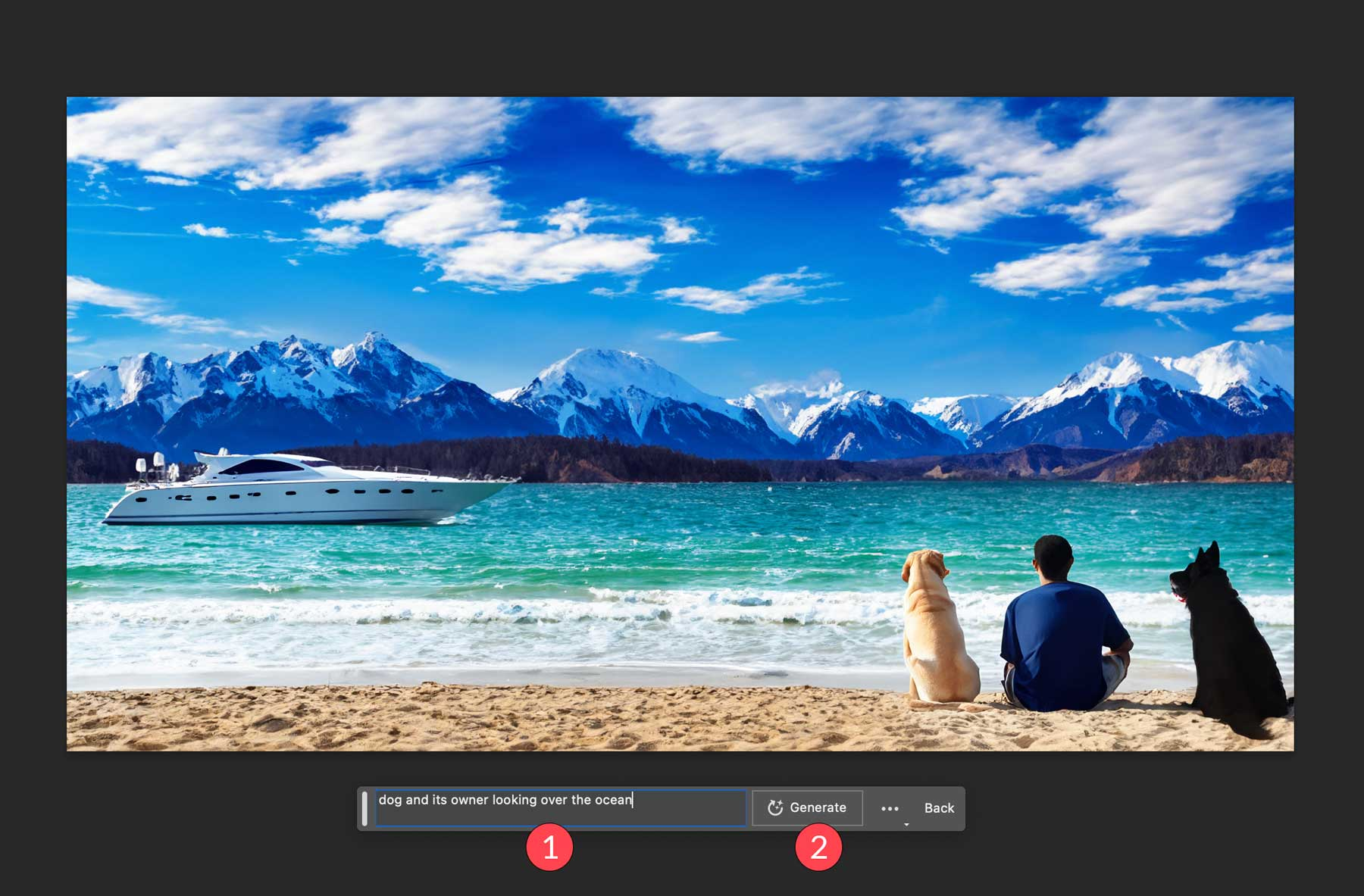 Jako poslední přidáme muže se dvěma psy, který se dívá na krajinu. Vytvořte výběr pomocí nástroje obdélníkový výběr přes pravý dolní roh složeného obrazu. Použijte textovou výzvu pes a jeho majitel se dívají přes oceán a poté klikněte na generovat.
